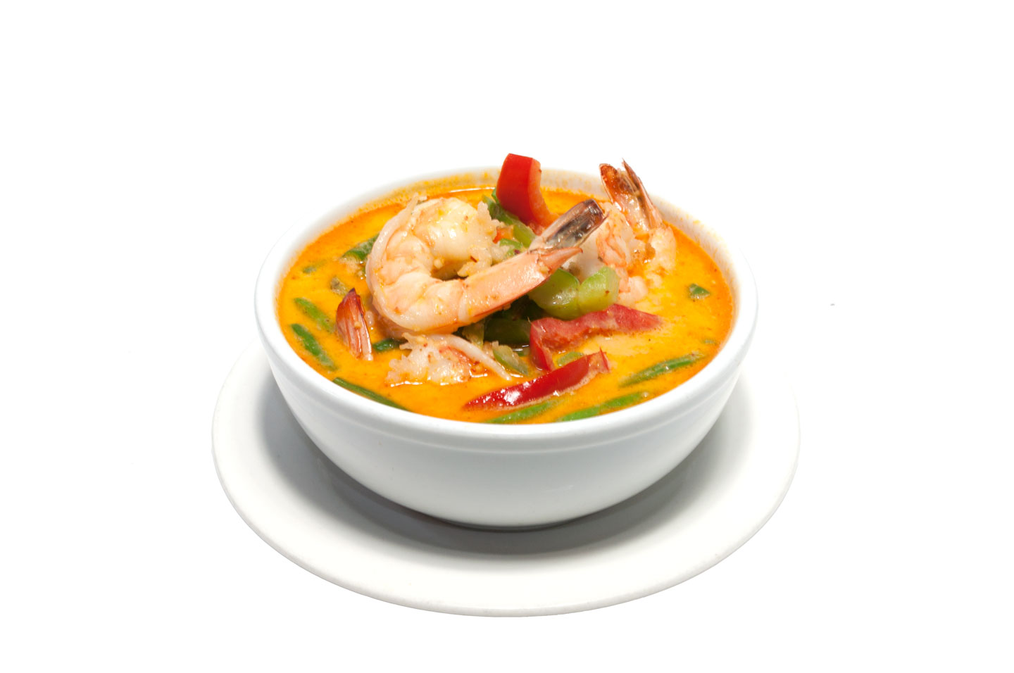 Shrimp with panang curry past, coconut milk, string beans, red bell peppers, ground peanut and kaffir lime leaves.