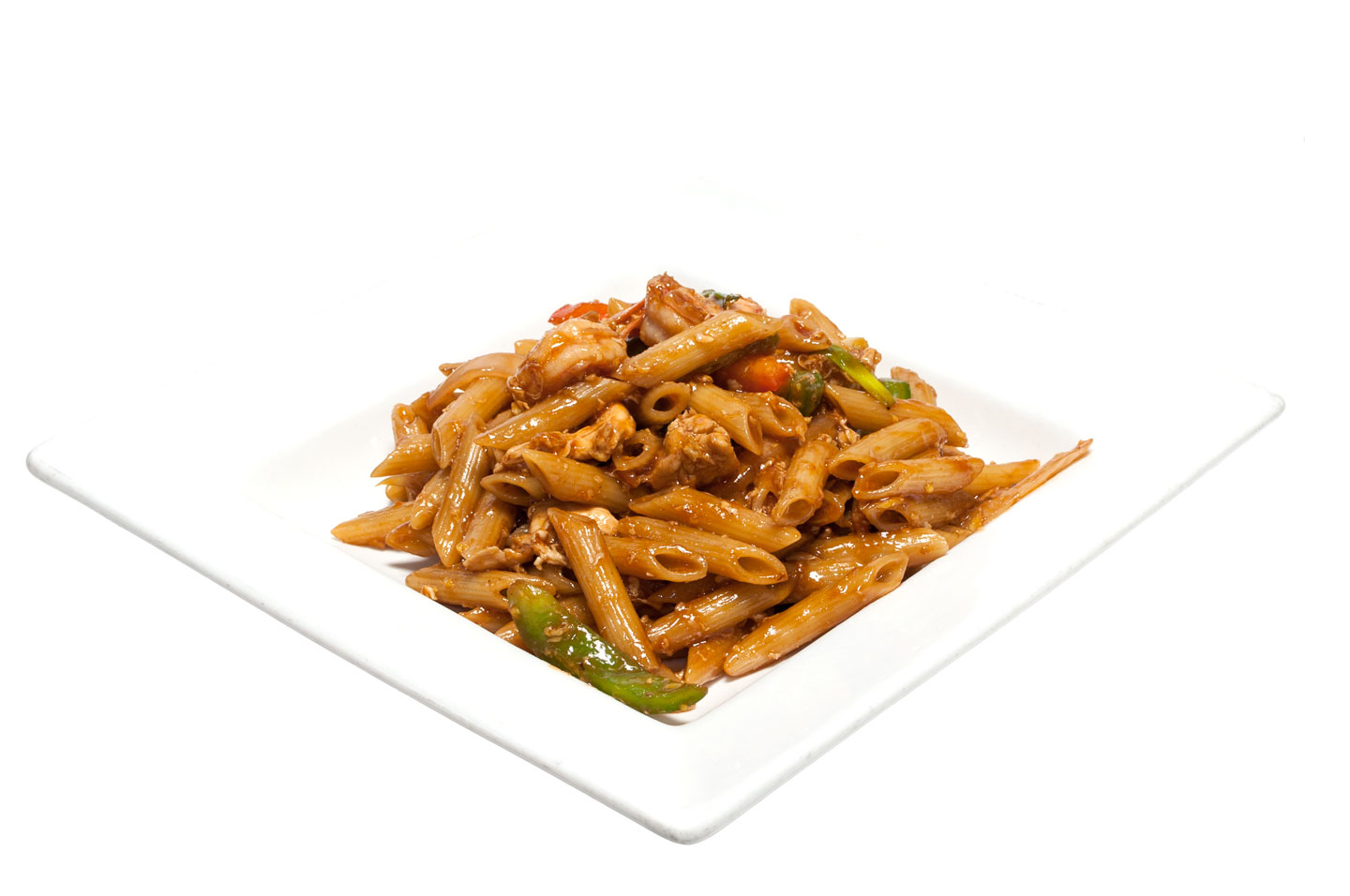 Stir-fried macaroni with chicken&shrimp (regular), onions, bell peppers, scallions, celery and tomato sauce.
