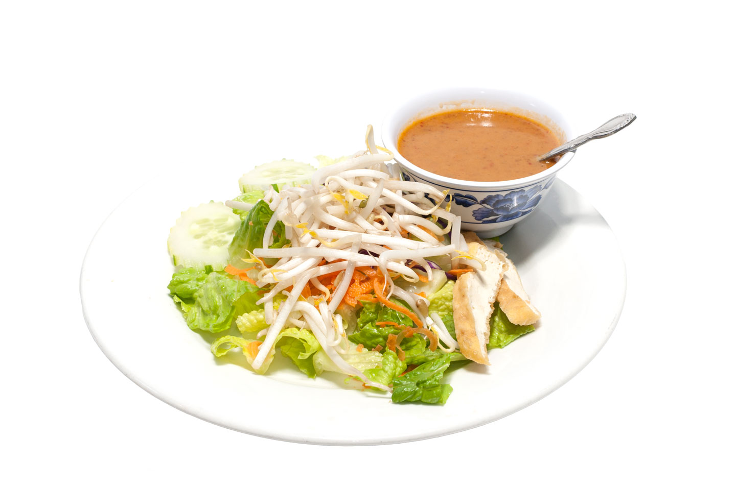 Fresh garden salad, bean curd, bean sprouts, onions, cucumbers, tomatoes served with Thai peanut sauce.
