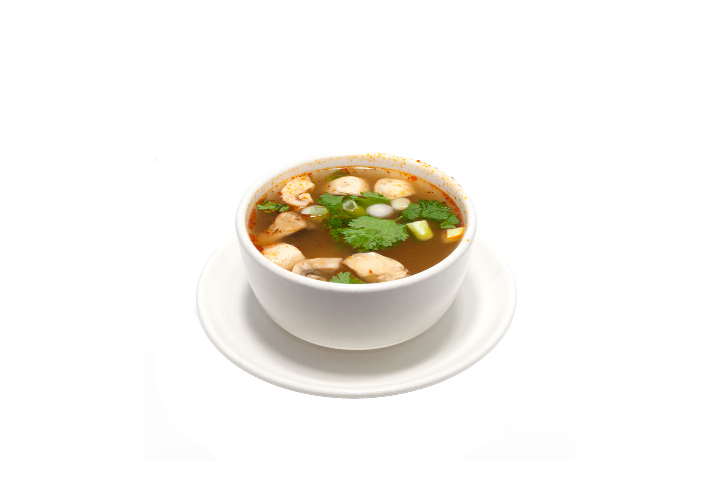 Thai spicy soup with shrimp or chicken, lemongrass, kaffir lime leaves, mushrooms, chili and lime juice.